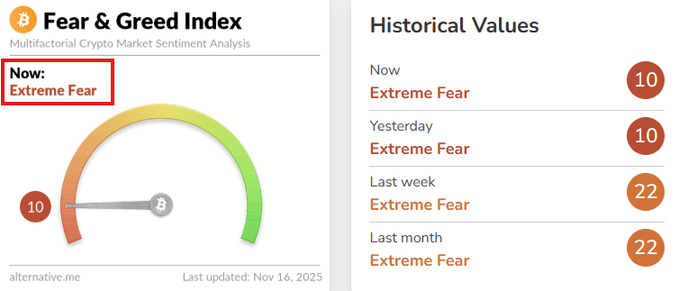 L'indice Crypto Fear & Greed est tombé à 10 : "Peur Extrême". Même niveau qu'en février 2025, alors que Bitcoin est quand même en hausse de 25% depuis avril.