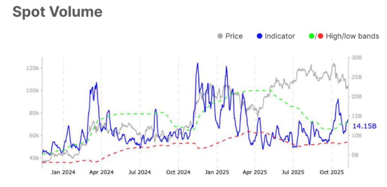 En parallèle, le volume de trading spot a augmenté de 23% (Quantité totale d'actifs échangés au prix actuel du marché), passant de 11,5 milliards à 14,1 milliards de dollars la semaine dernière. Ça suggère une activité spéculative en hausse.
